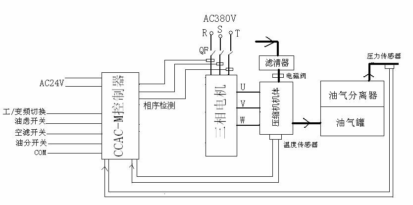 工頻頻驅動方式下,壓力傳感器檢測空壓機出氣口排氣壓力,根據(jù)設定的“上限壓力設置”和“下限壓力設置”值進行進氣閥的開啟和關閉操作,使得出口壓力穩(wěn)定在“上限壓力設置”與“下限壓力設置”值之間。由于螺桿式壓縮機嚴格要求不允許反轉,控制器會檢測引入空壓機系統(tǒng)的交流電源的相序,若有相序異常,將發(fā)出報警,使系統(tǒng)不能進入運行狀態(tài)。