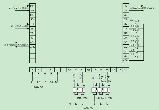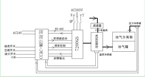 空壓機(jī)是各種工廠、筑路、礦山及建筑行業(yè)的必備設(shè)備,主要用來提供源源不斷的具有一定壓力的壓縮空氣,例如給氣動閥供氣,給需要一定壓力氣體的工藝流程提供氣源??諌簷C(jī)有很多種類,如螺桿式空壓機(jī)、活塞式空壓機(jī)、離心式空壓機(jī)、渦旋式空壓機(jī)等等,而螺桿式空壓機(jī)的市場潛力極大,并在很多行業(yè)得到廣泛的運(yùn)用。空壓機(jī)在其控制中采用加載—卸載閥來控制空壓機(jī)的供氣,由于用氣設(shè)備的工作周期或是生產(chǎn)工藝的差別,使得用氣量發(fā)生波動,有時會造成空壓機(jī)頻繁加載、卸載??諌簷C(jī)卸載后仍然工頻運(yùn)轉(zhuǎn),不僅浪費(fèi)電能而且增加設(shè)備的機(jī)械磨損,并且加載是是一個突然的過程,會對設(shè)備和電網(wǎng)造成較大的沖擊。因此對空壓機(jī)進(jìn)行變頻改造具有改善電機(jī)的啟動和運(yùn)行、減少設(shè)備的機(jī)械磨損、在一定范圍內(nèi)節(jié)約電能等效果。本文主要講述臺安空壓機(jī)控制器與東元7200GS變頻器組成的控制系統(tǒng)在螺桿式空壓機(jī)上的應(yīng)用。