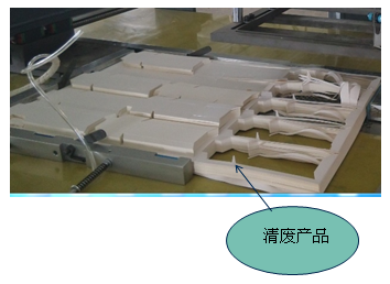 1.采取機械頂針排廢方式。模架下壓固定住材料,然后通過油缸將頂針頂出,沖出成品,功率較大,對材料較厚的產(chǎn)品有很好的清廢效果。